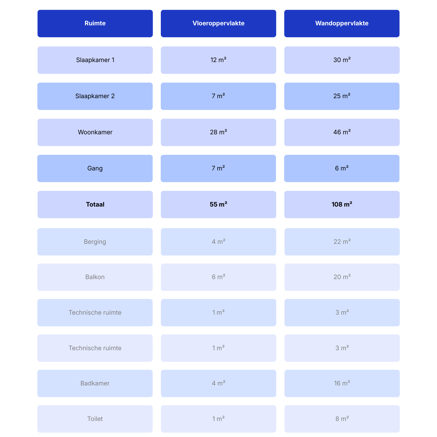 Binnen enkele minuten een nauwkeurig overzicht van alle vloer- en wandoppervlaktes per ruimte.